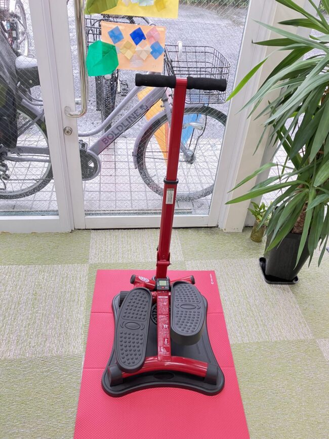 ふくろうには機能訓練用の器具が三台あります。 ステッパーとは、ステップ板に足を乗せて左右交互に足踏みを行う器具です。足を鍛えることやお腹の深層部にある腸腰筋を刺激できます。ふくろうのステッパーは手の支えは使わずに足踏みを…